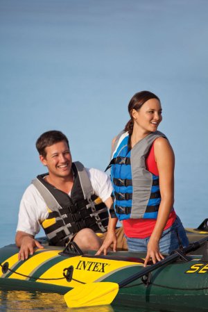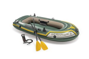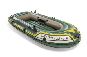 Člun pro 2 dospělé osoby, 3 vzduchové komory, velmi odolný materiál, vak na výbavu, držáky pro uchopení, držáky vesel a 2 prutů, záchytný provaz po celém obvodu, 2 pádla a pumpa, nosnost 240kg