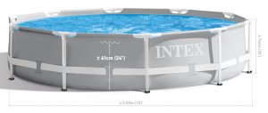 Specifikace: Druh: bazénový set Konstrukce: pevná Barva: šedá Objem vody (90% výšky stěny): 4485 l Průtok vody na čerpadlo (výkon čerpadla): 1 250 l Rozměry: 305×76 cm Obsah: Jeden bazén, filtrační čerpadlo Filtr čerpadla (220–240 V)