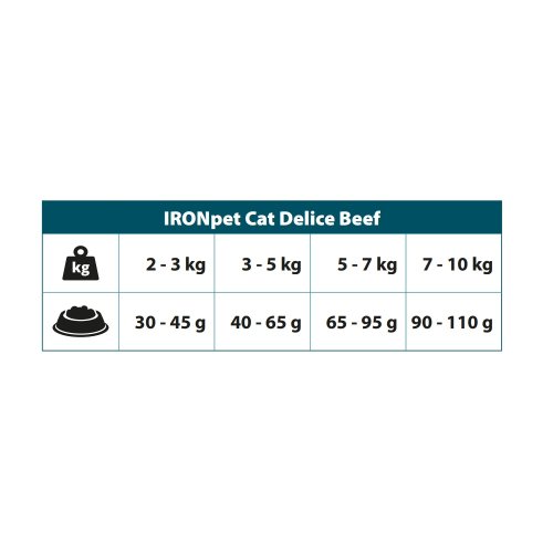 Zdrojem živočišných bílkovin s vyváženým poměrem bílkovin a tuku je použito hovězí maso. IRONpet Cat Delice Beef (Hovězí) neobsahuje lepek a kuřecí maso je tedy hypoalergenní, snadno stravitelné a vhodné i pro kočky s citlivým trávením.