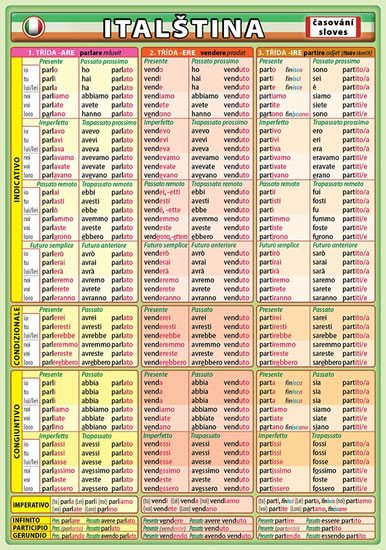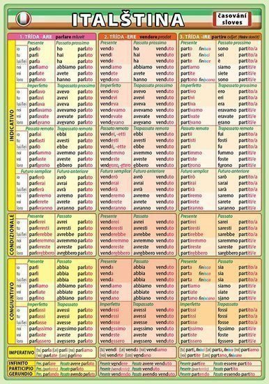 Přehledné tabulky časování italských pravidelných, zvratných a pomocných sloves.