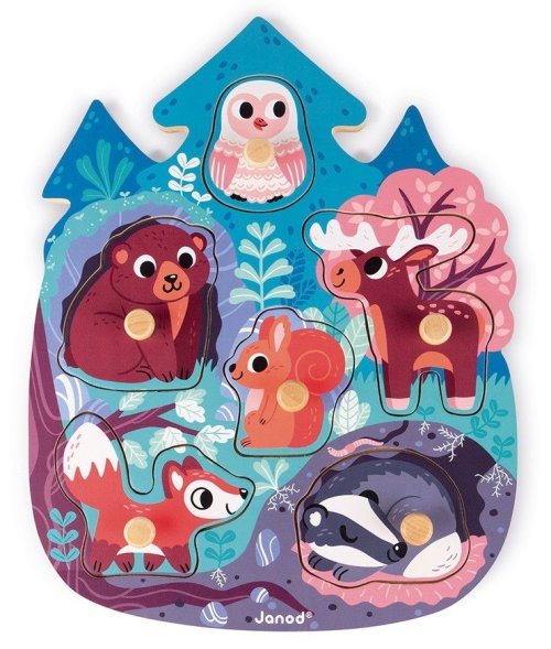 Barevná dětská vkládačka se šesti zvířátky žijících v lese. Vkládačka děti učí všímavosti, rozvíjí představivost a paměť. Dřevěná podložka usnadňuje skládání a rámečky zabezpečují, aby jednotlivá dřevěná zvířátka držela na svých místech. Děti se mohou učit poznávat lesní zvířátka. Pomocí dřevěných úchytek jim půjde vkládání obrázků do žlábků samo a snadněji si zapamatují, jak vypadá sova, medvěd, jelen, veverka, liška nebo jezevec. Vhodné pro děti od 12 měsíců.