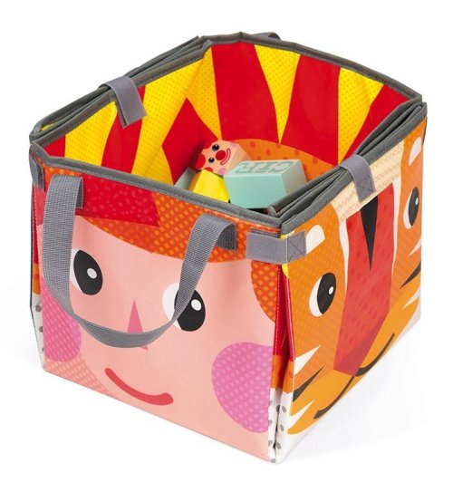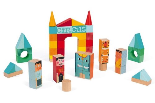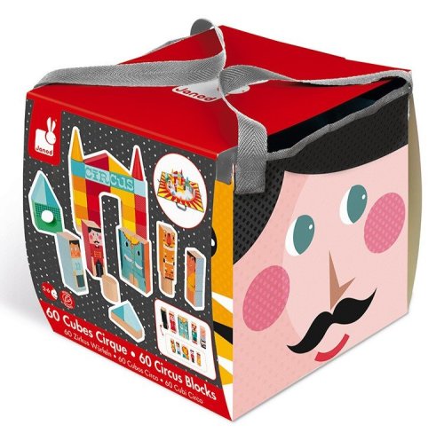 Vzhůru do cirkusu! Sada obsahuje 60 krásně malovaných dřevěných kostek a podložku s motivem cirkusu. Podložka na hraní se dá poskládat do tvaru krabice, do které si děti po hře mohou uložit své kostky.