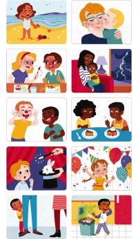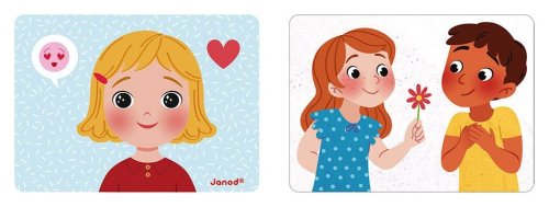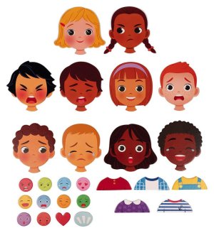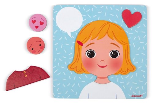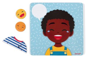 Emoce a pocity - Tato magnetická hra pomůže dítěti rozeznat emoce díky ilustrovaným kartám, které představují různé životní situace. Na každé kartě je zobrazena tvář, která emočně napodobuje danou situaci na zadní straně karty. Pomocí magnetů si dítě zkusí přiřadit jednotlivé výrazy k dané situaci. Existují 2 úrovně hry: Jednoduše stačí napodobovat výraz tváře na kartě, starší děti můžou zkusit uhodnout, jaké emoce odpovídají dané životní situace. Zrcadlo umožní dítěti napodobovat jednotlivé výrazy. Balení obsahuje: - 1 dřevěnou desku - 27 magnetů (10 obličejů, 10 smajlíků, 7 ks oblečení) - 20 karet zobrazujících danou životní situaci Vhodné pro děti od 2 let.