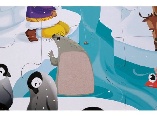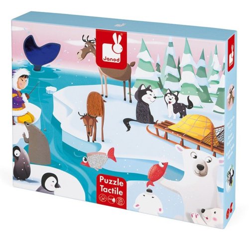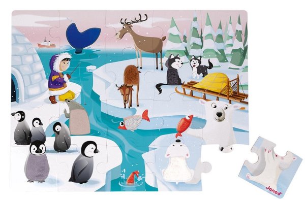 Dětské puzzle JANOD s motivem zvířátek žijících za polárním kruhem. Každým poskládaným kouskem se vaše děti učí jak vypadají polární zvířátka nejen vizuálně, ale díky speciálnímu povrchu některých dílků puzzle i dotykem! Puzzle rozvíjejí logické myšlení, pozornost, paměť, představivost, rozlišování barev, tvarů a velikosti. Učí děti vnímat vztah mezi částmi a celkem a jsou užitečné při rozvoji motoriky rukou. Rozměr složeného puzzle cca 65 x 50 cm