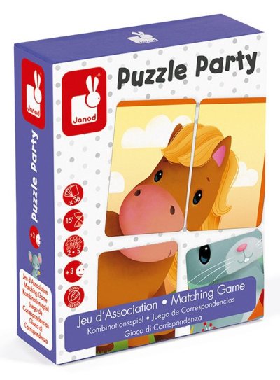 Karetní hra Párty puzzle na způsob kvarteta. Cílem hry je být prvním, kdo poskládá, jako puzzle, obrázek zvířátka. Karetní hra pro děti na zdokonalení koncentrace a smyslu pro pozorování. Kartičky je možno využit i v dřívějším věku na učení barev. Balení obsahuje 36 karet (rozměry 7,5 x 10 cm). Hra rozvíjí: