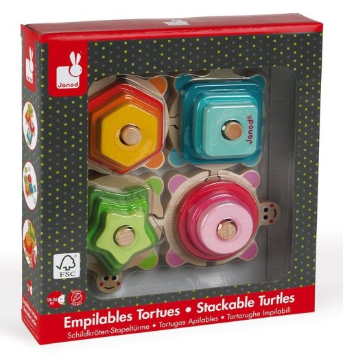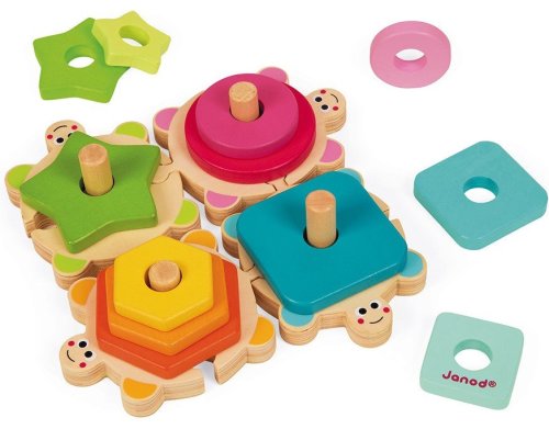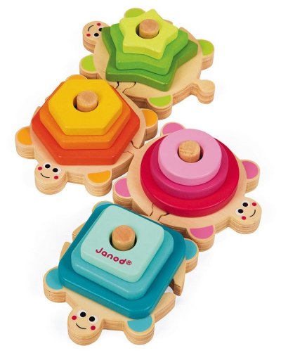 Nechte se unést barevným světem barev a tvarů! Nádherné barevné dřevěné vkládací puzzle ve tvaru želvy jsou skvělou pomůckou pro rozvoj jemné motoriky. Zároveň se děti učí barvám a základním tvarům, vkládáním barevných dřevěných kousků různého tvaru na příslušné vyčnívající místa na zádech želviček. Želvy se dají od sebe oddělovat a spojovat. Vhodné pro děti od 12 měsíců.