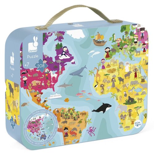 Dětské pozorovací kulaté puzzle JANOD. Nádherně ilustrované puzzle s motivem východní a západní polokoule naší planety s obrázky živočichů, to vše v praktickém kufříkovém balení. Děti i dospělí si užijí zábavu při skládání 208 dílků puzzle, a zároveň se učí, kde žijí jednotlivé druhy zvířátek. Rozměr poskládaných puzzle je průměr 50 cm. Rozměr složeného puzzle cca průměr 50 cm