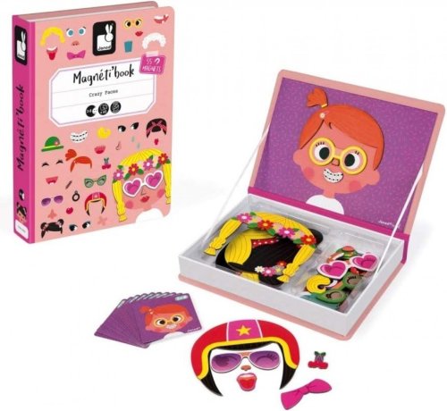 Magnetická kniha - úžasná naučná hračka! Děti skládají veselé obrázky pomocí dílků. Dítě vybírá různé oči, brýle, vlasy a doplňky, nejprve podle předlohy a potom podle vlastní fantazie. Praktické balení zajistí, že se hračka dá pohodlně přenášet. Děti se s ní zabaví nejen doma, ale i na dlouhých cestách. Magnetická kniha pro děti je krásná nadčasová hračka pro každé dítě, která se bude líbit několika generacím a je vyrobená z kvalitních materiálů a zdravotně neškodných barev. Balení obsahuje 10 kartiček s předlohami a 55 magnetických dílků. Vhodné pro děti od 3 let.