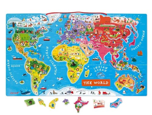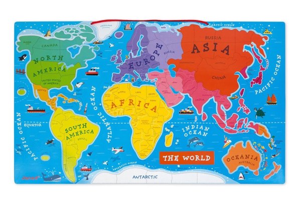 Zábava s magnety! Ví Vaše dítě, kde leží Madagaskar? Na kterém pólu žijí tučňáci? Odkud a kam vede Transsibiřská magistrála? Kde jste byli loni na dovolené? Chcete, aby Vašemu dítěti i další zeměpisné pojmy navždy vryly do paměti? Pořiďte mu velkou mapu světa se spoustou zajímavých detailů a naučte ho zeměpis hravou formou! Krásná magnetická mapa světa (rozměry 77 x 46 x 1 cm) obsahuje 92 dřevěných dílků puzzle, kde každý z nich reprezentuje region nebo zemi, nese název hlavního města a obsahuje obrázek charakterizující dané místo (významné stavby, památky, zvířata a rostliny z dané oblasti). Mapa je v anglickém jazyce . Mapu lze zavěsit na zeď, čímž se stává mimořádným doplňkem dětského pokoje. Vhodné pro děti od 5 let.