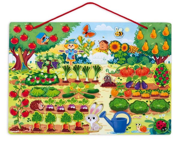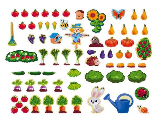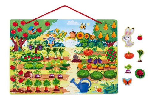 Zábava s magnety! Magnetická tabule Moje zahrada na zavěšení, na kterou si děti mohou připevňovat krásné magnetky se vším, co najdeme na zahrádce. Děti se díky tabulce naučí, co všechno lze na zahrádce pěstovat. Zahrádku si mohou zalévat, aby jim zelenina dobře rostla, i strašáka je třeba svědomitě umístit, aby zaplašil všechny škůdce. V balení naleznete i magnetky zvířátek, se kterými si děti mohou hrát a zároveň se naučit, co všechno jí například králík. Sada obsahuje 70 magnetek. Vhodné pro děti od 3 let.