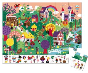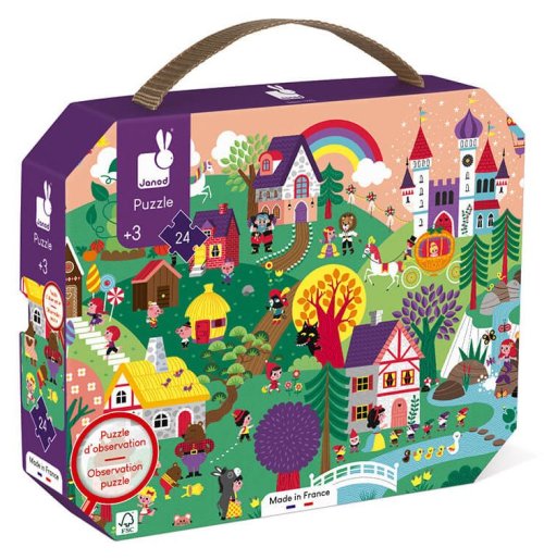 Pozorovací puzzle JANOD s pohádkovým motivem. Na okraji poskládaného puzzle se nachází několik různých obrázků, které jsou zakomponovány v ilustrovaném obrázku složených puzzle. Úkolem dítěte je co nejdříve najít jednotlivé obrázky. Puzzle jsou baleny v originálním a praktickém kufříku se zavíráním, takže jsou vždy uklizené a zároveň jsou pěkným doplňkem do dětských pokojíčků. Součástí balení je i plakát, který se může použít jako šablona. Rozměr složeného puzzle cca 54 x 41 cm