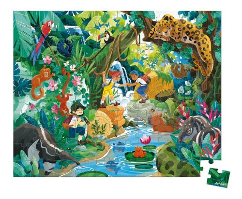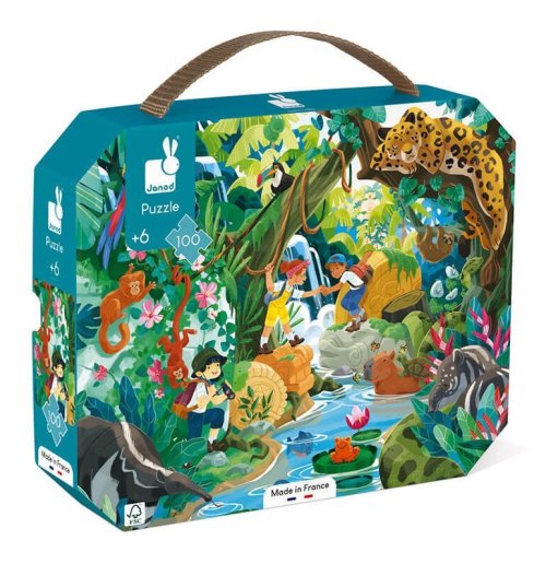 Puzzle v kufříku JANOD s motivy džungle - Prozkoumej džungli a najdi v ní se svými přáteli ukrytý chrám Inků! Tyto kartonové puzzle se 100 dílky jistě okouzlí a zabaví nejedno malé dítě. Puzzle rozvíjí logické myšlení, pozornost, paměť, představivost, jemnou motoriku, a zároveň se děti učí vnímat vztah mezi částmi a celkem. Puzzle je baleno v originálním a praktickém kufříku, který je vhodný na doma, ale i na cesty, včetně plakátu, který slouží jako šablona. Látková rukojeť umožňuje snadné přenášení. Rozměr složeného puzzle cca 50 x 40 cm