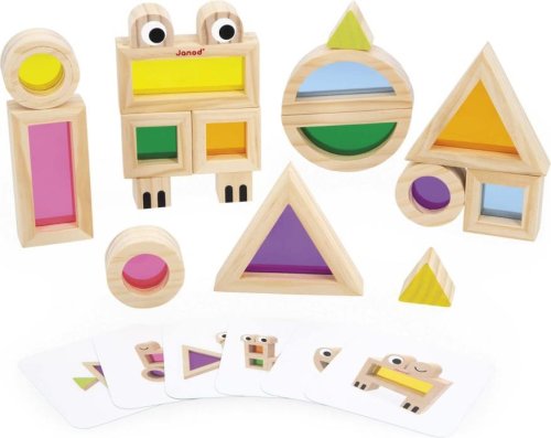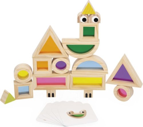 12 barevných průhledných kostek v různých odstínech (růžová, modrá, zelená aj.) 6 potištěných dřevěných bloků pro tvorbu veselých zvířátek 6 inspiračních šablonových karet , které pomáhají s prvními nápady a motivují k vlastní tvorbě