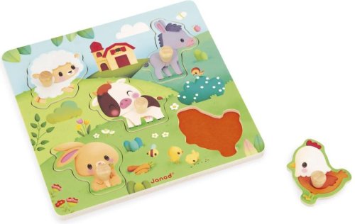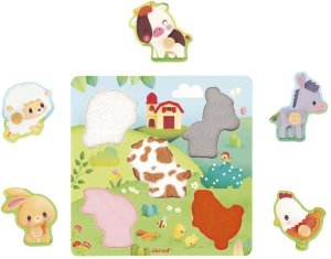 Pět vkládacích obrázků s motivy zvířátek pod sebou ukrývají nevšední zážitek. Vkládačka má ve vyfrézovaných otvorech ukázku pokožky vyobrazených zvířátek. Součástí každého dílku je i praktický úchyt. Dítě se podle tvarů snaží najít správný obrázek (rozvoj představivosti a logického myšlení), a umístit jej do správného otvoru (rozvoj jemné motoriky).