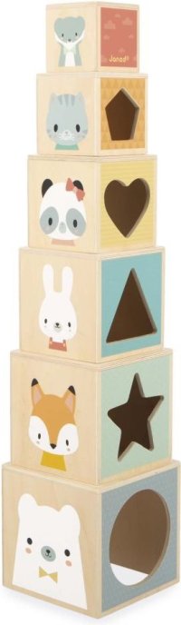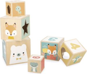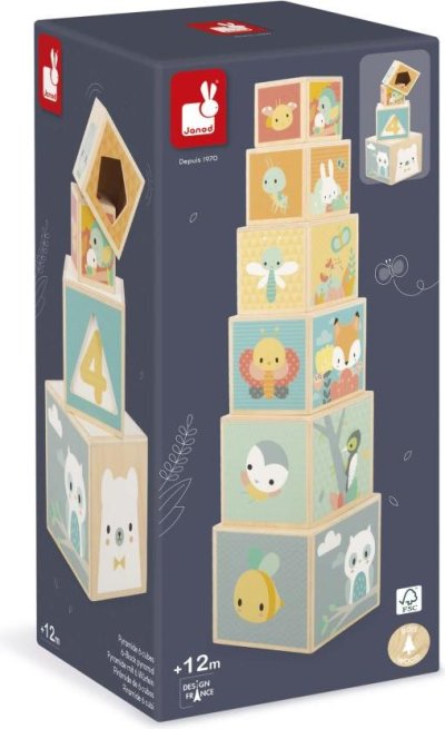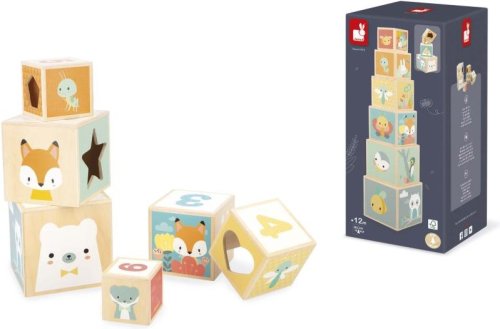 Stohování, třídění a obracení kostek pomáhá dětem pochopit principy rovnováhy, velikostí i prostoru. Hračka zaujme svým jemným barevným provedením a láskyplnými ilustracemi, které rozvíjejí představivost.