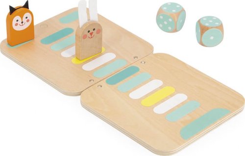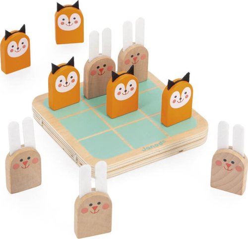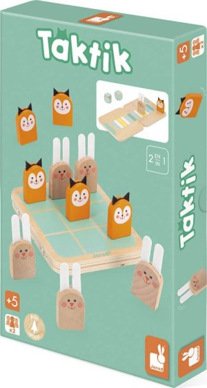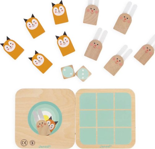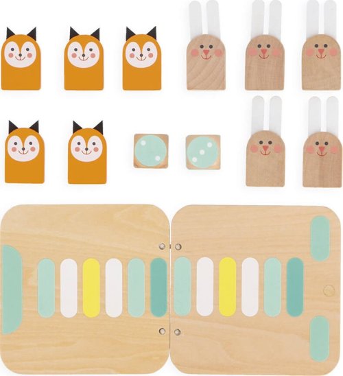 Roztomilá hra 2v1, kterou si můžete vzít kamkoli s sebou! Malí králíčci a lišky s plstěnýma ušima vám budou dělat společnost při hraní dvou různých her na jedné hrací desce! První hra: Morpion (Tic Tac Toe) - Piškvorky Hráči se střídají v umisťování figurek na hrací desku. Jako první seřaďte tři stejné figurky a vyhrajte hru, a to diagonálně, vertikálně nebo horizontálně. Druhá hra: Honička. Hráči se střídají v házení kostkou a posouvají svou figurku. Pozor, k vítězství je třeba získat přesné číslo, abyste mohli přistát na posledním políčku! V opačném případě se vraťte a začněte znovu! Pokud hráč během závodu dorazí na již obsazené políčko, zaujme místo svého soupeře, který se vrátí na start. Balení obsahuje: 1 oboustrannou hrací desku, 5 králíčků, 5 lišek a 2 kostky, návod.