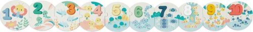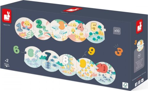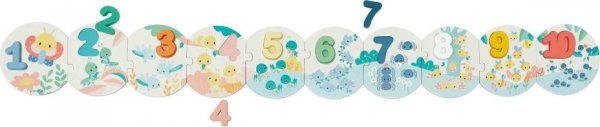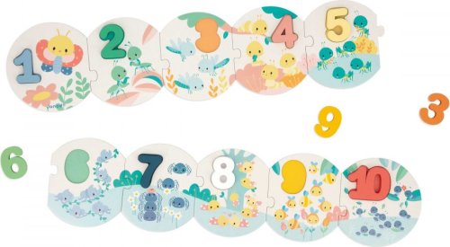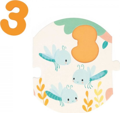 Snadno uchopitelné pro malé ručičky dětí od 2 let. Zvířátka dětem zpříjemní počítání do 10. Po složení desetidílné skládačky je třeba umístit jednotlivá čísla na správné místo. Chronologické řazení čísel Děti budou moci zvířátka spočítat a určit správné číslo u každého dílku (např. 3 vážky, 8 berušek). Součástí balení je předloha. Naučné puzzle - ideální pro rozvoj jemné motoriky. Čísla lze po skončení hry uložit do bavlněného sáčku. Mimořádně roztomilé ilustrace, které dítě provázejí procesem učení