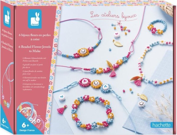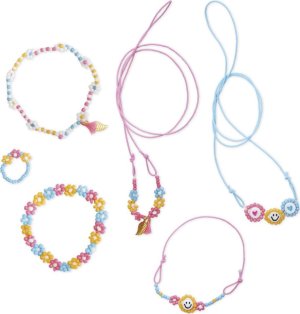 tato kreativní sada nabízí dětem možnost vyrobit si 6 květinových šperků sponky si mladé umělkyně vytvoří a následně své výtvory mohou hrdě nosit nebo podarovat kamarádky z této kreativní sady lze vyrobit 3 náramky, 2 náhrdelníky a 1 prsten zhotovení 6 šperků zabere přibližně 3-4 hodiny, hotové výrobky tak dětem dodají uspokojení z vlastní tvorby ideální aktivita k podpoře kreativity, motoriky, trpělivosti a soustředění balení obsahuje: 1 bílá voskovaná nit, 2 elastické šňůrky (modrá a růžová), 1 průhledná nylonová nit, 2 korálky "smajlík", 2 korálky "srdíčka" (růžová a modrá), 4 druhy korálků (bílá, růžová, oranžová a modrá), 2 malé neonově růžové střapce a 2 zlaté přívěsky