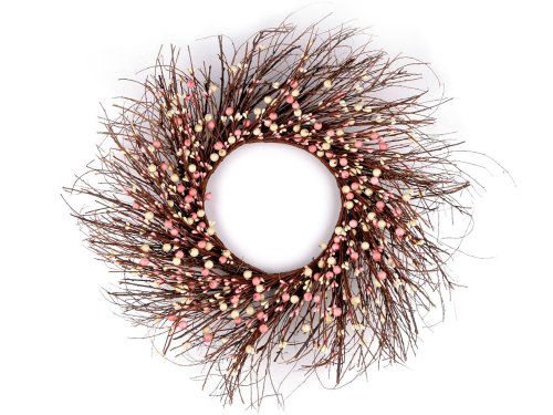 Věnec bohatě zdobený barevnými bobulemi vám zútulní interiér během jara a podzimu. Střídají se na něm umělé větvičky s přírodními. Věnec vynikne jako dekorace na stole, na dveřích a také na zdi.