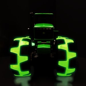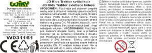 JD Kids Monster Treads. John Deere traktor se svítícími koly. Baterie 3xAAA (LR03) - součástí balení, krytka pod vyklápěcí kapotou traktoru. Volná kola. Při otáčení se kola rozsvítí. ON/OFF spínač na spodní straně.