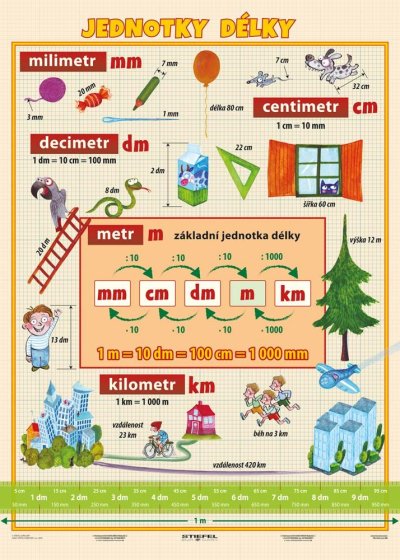 Naučná tabulka napomáhá žákům orientovat se v jednotkách délky a osvojit si vztahy mezi nimi. Obsah přední strany tvoří jednotky délky mm, cm, dm, m a km s názornými ilustracemi a přehledná tabulka s převody jednotek délky s užitím měnitele 1000, 100, 10. Ilustrace jednotek jsou zvoleny co nejtypičtěji, aby vedly k jejich snadnému zapamatování a také umožňovaly provádět odhad délky a vzdálenosti. Zadní strana obsahuje názorné úlohy na procvičování převodu jednotek délky.