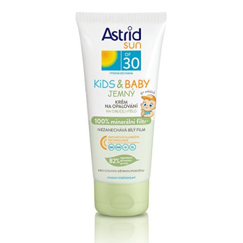 Jemný krém na opalování pro děti OF 30 Sun Kids & Baby obsahuje 100% minerální filtry, které jsou vhodné pro pokožku se sklonem k alergii. Je určen především pro citlivou jemnou pokožku dětí, obsahuje 82% ingrediencí přírodního původu a je vysoce voděodolný.