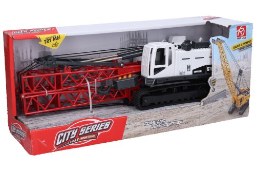 Jeřáb pásový s efekty. Velikost 42 cm. Vydává světelné a zvukové efekty. Aktivace tlačítky na střeše. Baterie 3xAG13, součástí balení.