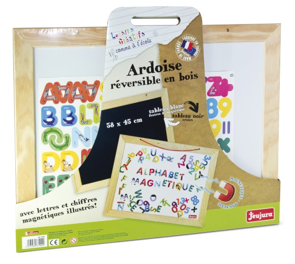 Závěsná oboustranná magnetická tabule. Na černou tabuli se píše a kreslí křídou, bílou tabuli lze popisovat zvlášť určenými fixy a mazat plstěnou houbičkou. Vyrobeno ve Francii, z masivního bukového a borovicového dřeva francouzského původu. Součásti jsou ošetřeny výhradně za použití barev a laků na bázi vody. Baleno v kartonu potištěném rostlinnými inkousty. Součástí balení je sada vzorovaných magnetických písmen. Hlavní vlastnosti:tabule a sada magnetických písmenrozměry tabule 58x45 cmoboustranná pro křídy/fixy, magnetickávyrobeno ve Francii