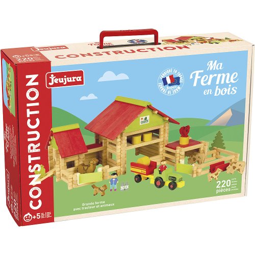 Dřevěná stavebnice, která seznámí malé stavitele se životem na farmě, se stane ozdobou dětského pokoje. Stavebnice Jeujura Constructions mají dlouhou tradici a patří mezi klasické francouzské hračky. Nabízí série tématicky věnované chatám, domkům a farmám, ale také divokému západu a středověku. Dají se mezi sebou volně kombinovat a k řadě z nich je také nabízeno příslušenství, figurky a vozidla. Jsou vyráběny ve Francii, z masivního bukového a borovicového dřeva francouzského původu. Dílky jsou ošetřeny výhradně za použití barev a laků na bázi vody. Každá sada je balena v praktickém lepenkovém kufříku potištěném rostlinnými inkousty a součástí balení je snadno pochopitelný návod. Hlavní vlastnosti: 220 dílků z masivního dřeva a podložkapraktické balenívyrobeno ve Francii
