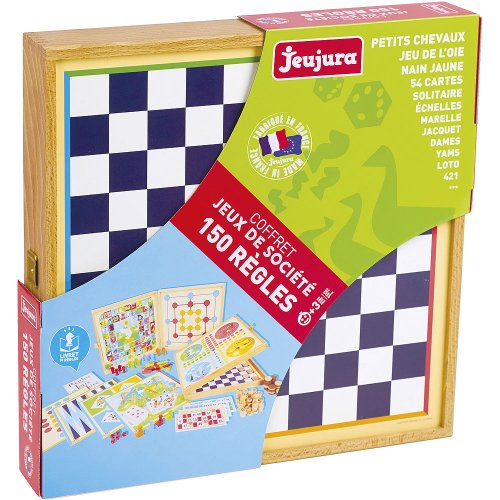 Rozsáhlý soubor stolních, deskových a karetních her v uceleném praktickém balení. Naleznete zde dámu, mlýn, variantu člověče nezlob se s figurkami koní, husu a soubor obsahuje také balíček bridžových karet a žetony i kartičky pro bingo. Příslušenství ke hrám je společně s pravidly baleno v boxu, jehož plochy slouží jako herní desky. Souprava je vyráběna ve Francii, z masivního bukového a borovicového dřeva francouzského původu. Dřevěné součásti jsou ošetřeny výhradně za použití barev a laků na bázi vody, papírové příslušenství je potištěno rostlinnými inkousty. Hlavní vlastnosti:16 figurek koní, 4 figurky hus, 40 hracích kamenů, 5 kostek, dva druhy žetonů a 54 karetsoučásti z masivního dřevapraktické balenívyrobeno ve Francii