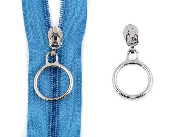 Kovový jezdec s táhlem v podobě kroužku je určený ke spirálovým zipům o šíři 3 mm v metráži, které u nás najdete pod kódem 750678, 050716, 060714. Průměr kroužku je 20 mm.