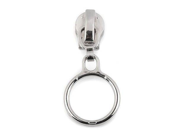 Kovový jezdec s táhlem v podobě kroužku je určený ke spirálovým zipům v metráži, které u nás najdete pod kódem 790304, 800963, [750994, 750503, 790305]. Průměr kroužku je 20 mm.
