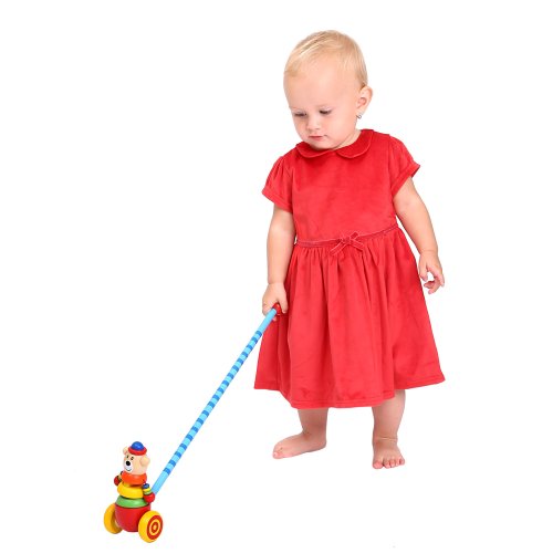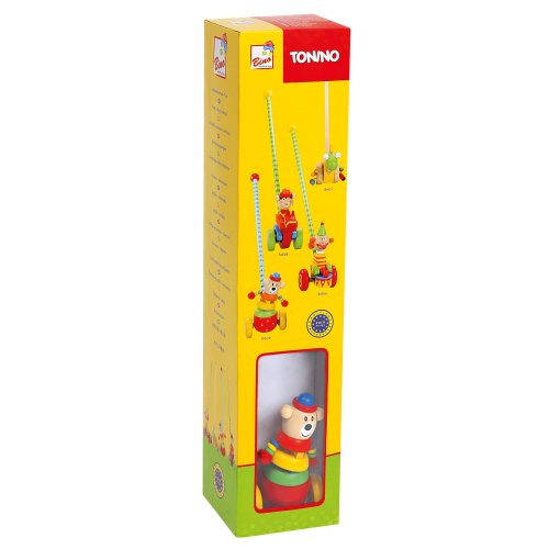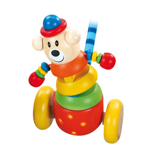 Dřevěný medvídek se při jízdě naklání z boku na bok. Rozměry: 7x7x55 cm.