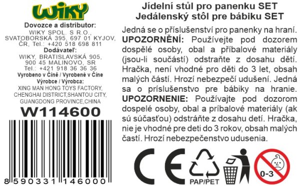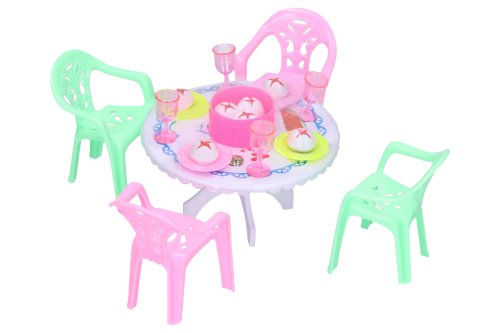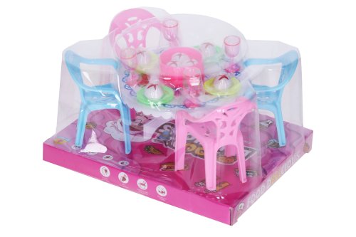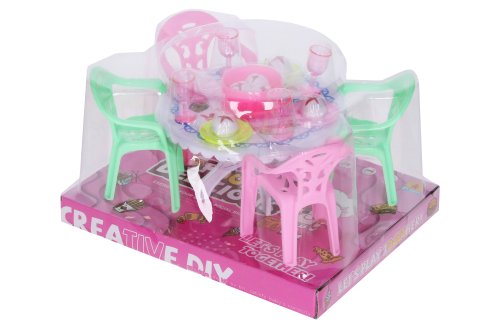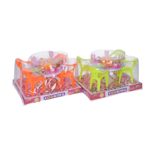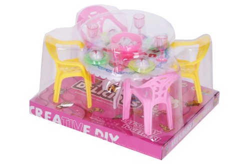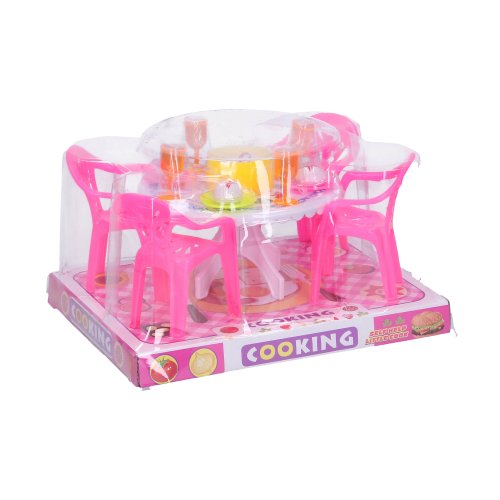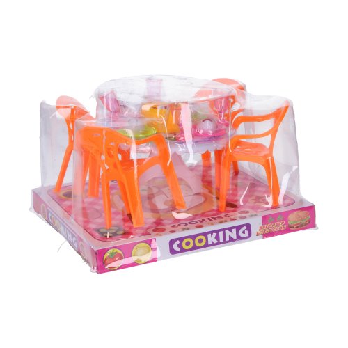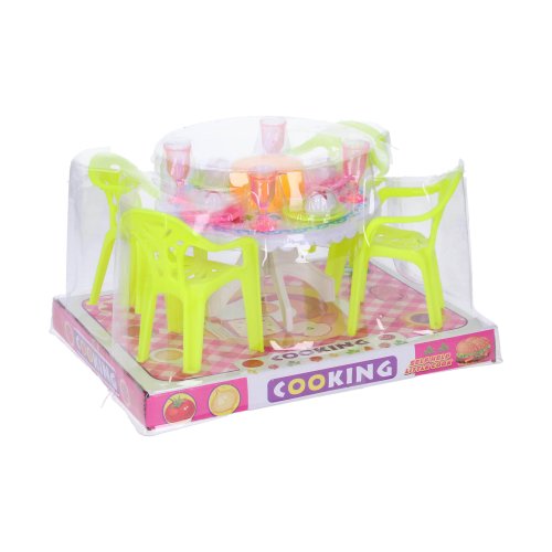 stoleček (10,5 cm) 4 židličky 4 skleničky 4 talířky se zákuskem 1 miska se zákusky Doporučený věk: od 3 let