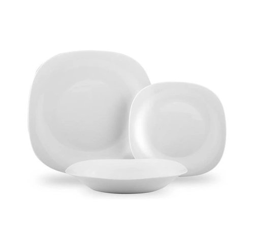 Parma je sada talířů vyrobená z lehkého a odolného opálového skla mléčné barvy. Nádobí ve tvaru čtverce se zaoblenými hranami jsou několikrát odolnější vůči nárazům, než nádobí z porcelánu. Toto nádobí je velmi hladké a snadné na čištění. Dokonalé hladký povrch lze jednoduše vyčistit a vysušit, a na jeho hygienickém povrchu se neusazují mikroorganismy nebo bakterie. A co víc, nádobí lze nejen použít v myčce, ale také použít v mikrovlnné troubě. Sada obsahuje: 6 ks dezertních talířů 20 cm, hlubokých talířů 23 cm, mělkých talířů 27 cm. Baleno v barevné kartonové krabici. EAN 5901832314691