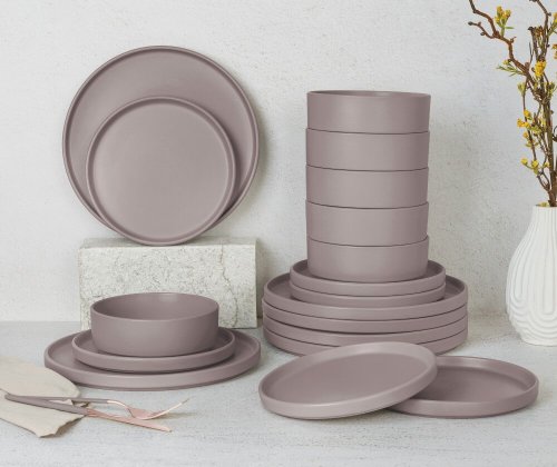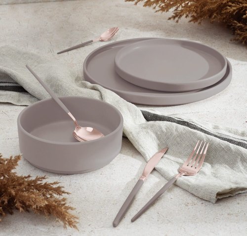 Tato sada nádobí, vyrobená z vysoce kvalitní kameniny, ztělesňuje dokonalou kombinaci odolnosti a krásy. Kamenina je známá svou silou a spolehlivostí, která zajišťuje, že vaše nádobí obstojí ve zkoušce času, aniž by ztratilo své kouzlo. Matná taupe povrchová úprava dodává vašemu stolu nádech sofistikovanosti, takže každé jídlo bude vypadat jako zvláštní příležitost.