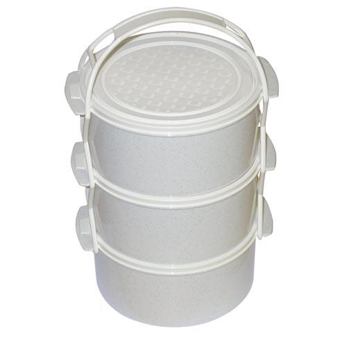 3 díly: 3 x 1,5 l materiál: plast Box na ukládání a přepravu jídla, složený ze 3 dílů, které jsou navzájem propojené držadlem.