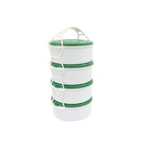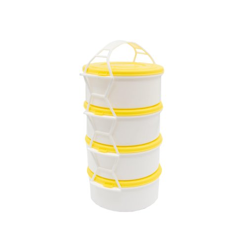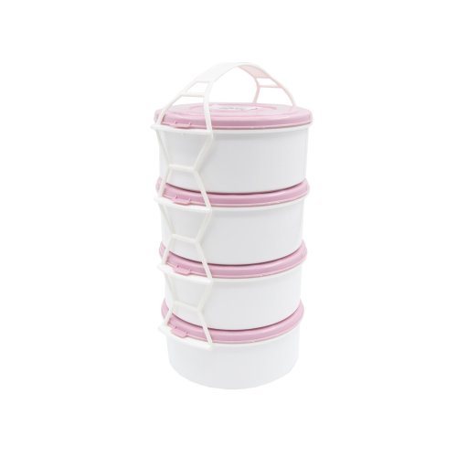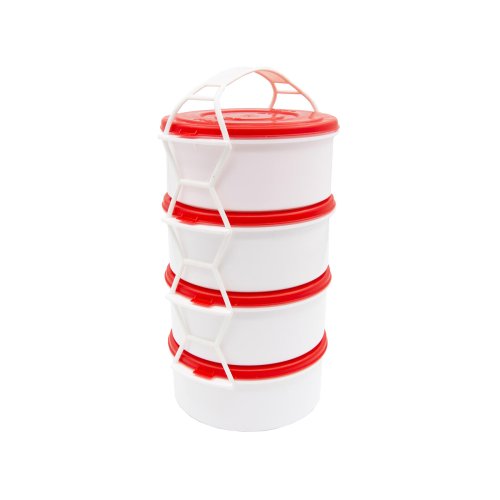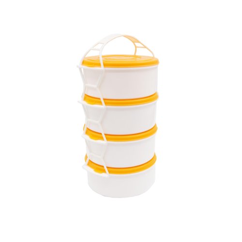 Box na ukládání a přepravu jídla, složený ze 4 dílů, které jsou navzájem propojené držadlem.