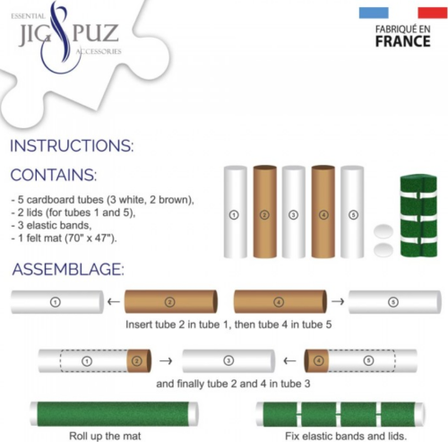 Rolovací podložka vhodná pro puzzle do velikosti 170 x 110 cm (odpovídá 6.000 dílků většiny výrobců). Kobereček na puzzle je ideální pro úsporu místa a bezpečné uchování nedokončeného i hotového obrázku. Podložka zajistí bezpečné uchování nebo transport vašeho puzzle. Kobereček pod puzzle je ideálním pomocníkem pro úsporu místa a bezpečné převážení nebo uchování rozeskládaného puzzle. Velký rozměr poskytuje dostatek místa pro roztřídění dílků. Balení obsahuje 5 dílů kartonových tubusů, zelenou filcovou podložku o rozměru 180 x 120 cm, 2 plastová víčka a 3 upínací pásky. UPOZORNĚNÍ: V případě zakoupení koberečku pro skládání puzzle jiných značek doporučujeme ověřit rozměry složeného puzzle. Údržba filcové podložky: Podložku lze žehlit na nejnižší teplotu nejlépe přes tenkou tkaninu (utěrku). Ruční praní ve studené vodě, neždímat a nesušit v sušičce.