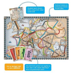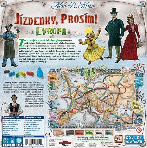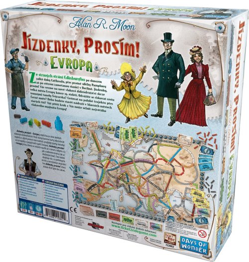Veleúspěšná hra o stavbě železnic po celé Evropě. Ze strmých strání Edinburghu po sluncem zalité doky Cařihradu, přes prašné uličky Pamplony až po větrem zametanou stanici v Berlíně. Jízdenky, prosím! Vás vezme na nové vlakové dobrodružství skrze velká města Evropy konce 19. století. Odvážíte se riskovat cestu temnými tunely Švýcarska? Cestovat na palubě trajektu přes Černé moře? Nebo budete stavět nádraží v hlavních městech starých říší? Váš příští krok z Vás může učinit největšího vlakového magnáta Evropy! Jízdenky, prosím! - Evropa je další hra ze série skvělých vlakových dobrodružství. Hráči sbírají barevné karty železničních vagónů a s jejich pomocí staví nádraží, projíždějí tunely, naloďují se na trajekty a spojují tratě napříč Evropou. To vše je postaveno na jednoduchých pravidlech, která hráče přímo vybízejí ke konkurenčnímu boji s protivníky. A právě na něm je založena neobyčejná krása této hry - neexistuje totiž nic příjemnějšího než na poslední chvíli postavit koleje tak, abyste přebrali soupeři nejdelší cestu a zároveň mu tak zabránili v jejím dalším prodlužování. Když k jednoduchým pravidlům popisujícím velmi zábavnou hru přidáte i rozumnou herní dobu (přibližně 45 min.) a skutečně fungující systém i v případě dvou hráčů, určitě chápete, proč hra získala mnoho ocenění a proč se celosvětově prodalo více než 6 milionů kopií hry ze série Jízdenky, prosím! (Ticket to Ride).