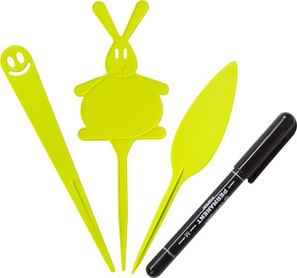 Jmenovky zapichovací k popisům rostlin a výsevů. Sada obsahuje 9 kusů jmenovek a lihový fix.