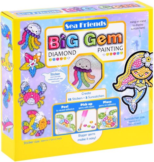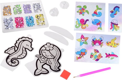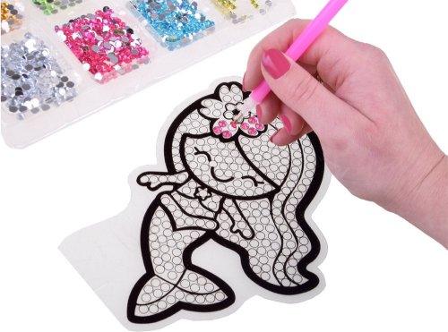 Balení obsahuje: barevné kamínky, aplikátor, misku, vosk, 2 sluneční lapače a 12 ks samolepek. Diamantové malování - postup: Horní strana samolepek je potažena lepidlem a překrytá průhlednou folií. Kamínky požadované barvy vysypejte do misky. Do hrotu pera naberte vosk, díky kterému se kamínky snadno přichytí na pero, a nanášejte na obrázek.
