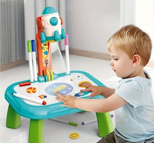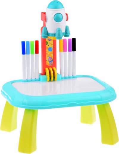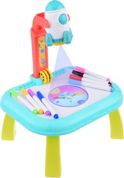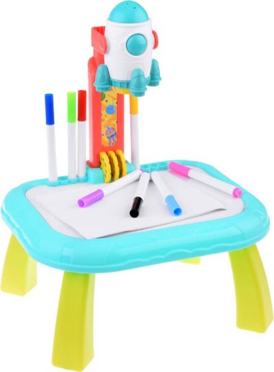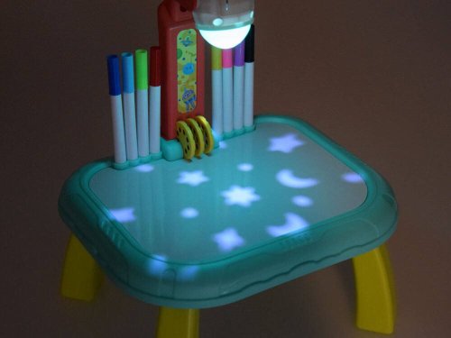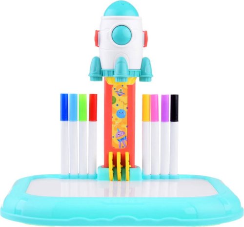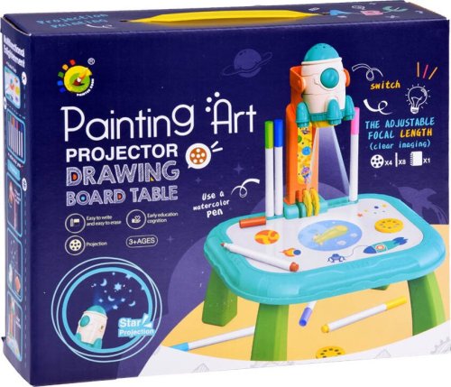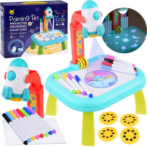 Kosmický projektor je skvělý nápad pro malé umělce, kteří rádi kreslí. Projektor má nastavitelný úhel náklonu, takže ho lze použít přímo na tabuli nebo promítat obrázky na stěnu. V horní části projektoru je projektor ve tvaru rakety. Po zapnutí tlačítka umístěného vpředu rakety se rozsvítí světlo, které vám umožní promítat hvězdnou oblohu na zeď nebo strop. Po opětovném stisknutí tlačítka se projektor zapne a můžeme zobrazit obrázky, jako jsou vesmírný svět, zvířata, vozidla a podmořský svět. Projektor má stolní desku, na které si dítě může uspořádat fixy, kreslit a kopírovat obrázky zobrazené na projektoru. Tabule je velmi pěkně provedena a bude poskytovat hodně zábavy. Velká zábava zaručena. Sada obsahuje