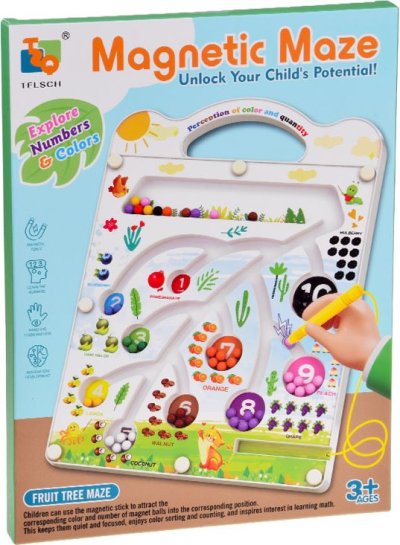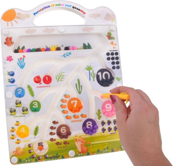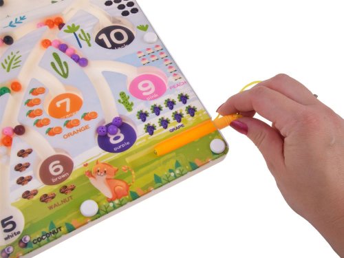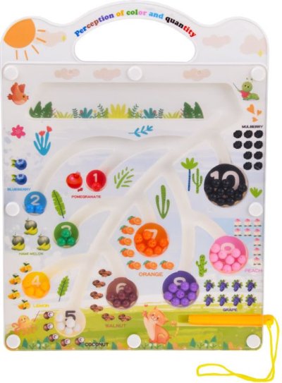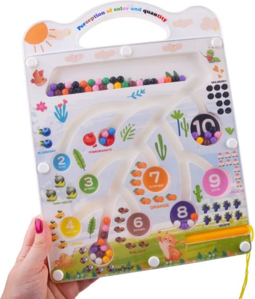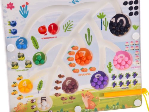 Deska je vyrobena z odolného plastu v příjemných barvách a zdobí ji poutavé, dětsky přívětivé motivy, které podporují chuť ke hře. Velkým plusem je, že všechny pohyblivé části jsou bezpečně uzavřené za průhledným sklem – kuličky se neztratí a nehrozí jejich spolknutí. Jak se hraje? Úkolem dítěte je pomocí speciálního magnetického pera navádět kuličky do správných otvorů. Proč si vybrat tuto hračku?
