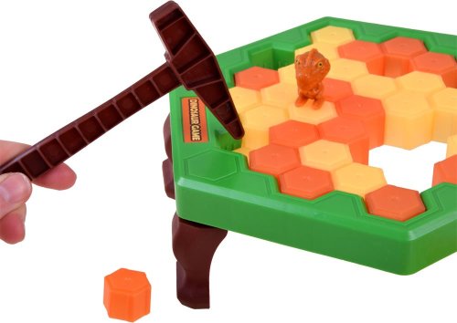 Jak hrát? Hráči se střídají v otáčení kola a ukazatel určuje, kolik a jaké barvy kostek mají shodit. V další fázi je třeba učinit důležité rozhodnutí. Kterou kostku srazit, abyste nesrazili dinosaura? S každým dalším kolem je rozhodování obtížnější. Kladivo do ruky! Je čas srazit vybranou kostku...Prohrává ten, kdo shodí kostky i s dinosaurem.