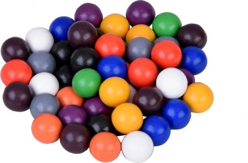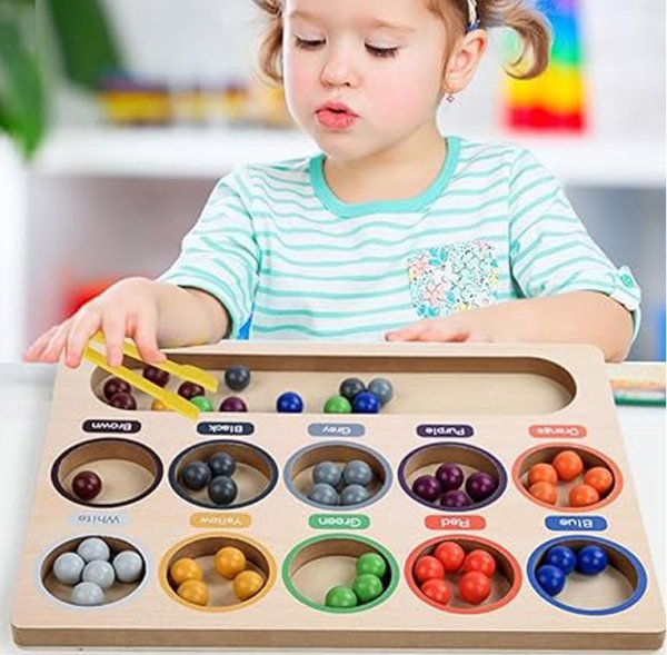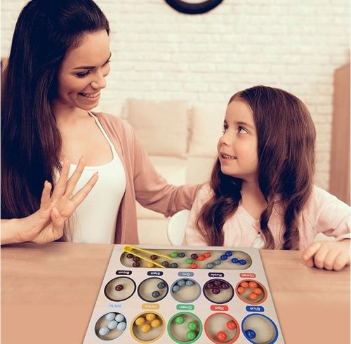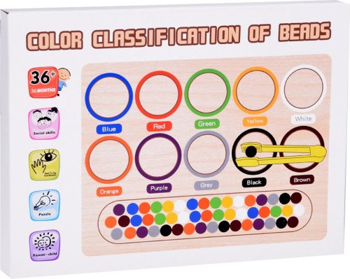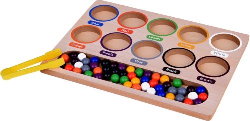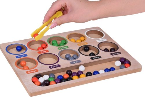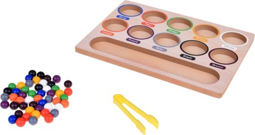 50 barevných kuliček (modrá, červená, zelená, žlutá, bílá, oranžová, fialová, šedá, černá, hnědá) Dřevěná deska s 11 otvory a nápisy barev v angličtině Pinzeta