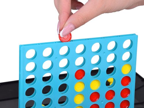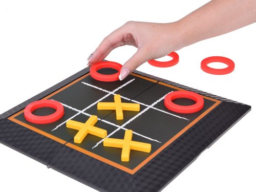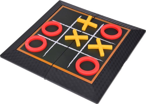 Počet hráčů: 2 Základna hry zároveň slouží jako úložný box pro všechny herní prvky. Po rozložení získáme tradiční herní desku na piškvorky s 9 políčky. Pravidla hry jsou jednoduchá – hráči si rozdělí symboly (kolečka a křížky) a střídavě umisťují prvky na vybrané pole. Jeden tah odpovídá umístění jednoho prvku. První hráč, který vytvoří řadu tří svých symbolů, vyhrává. Po otočení desky získáme základnu pro hraní Čtyři v řadě. Desku vložíme do základny a hráči si rozdělí žetony podle barvy. Žetony se vkládají do desky a hra pokračuje, dokud jeden z hráčů neumisťuje čtyři své žetony v řadě (svisle, vodorovně nebo diagonálně). Použijte logické myšlení a taktiku, abyste zablokovali soupeře a jako první vytvořili řadu! Rozměry rozložené základny cca 30 x 30 x 1,5 cm.