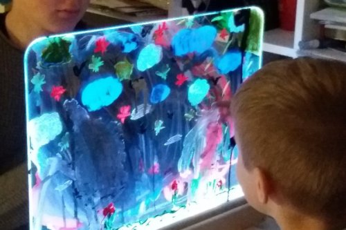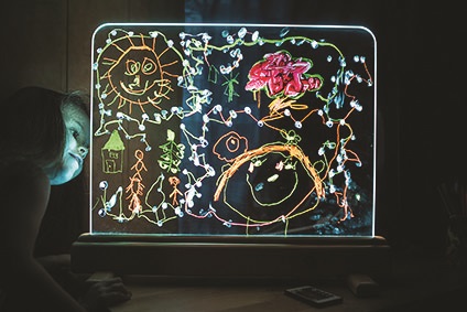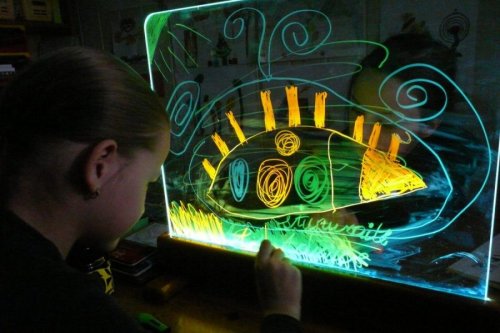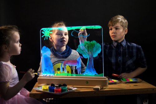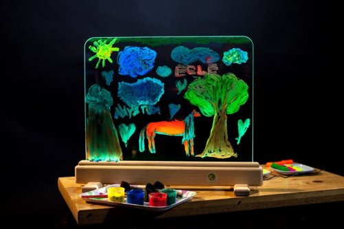 Exkluzivní magická světelná tabulka nabízí různorodé využití. Na tabulku z tvrzeného skla lze malovat především vodovými barvami, a to štětci nebo prsty, ale také smývatelnými fixy. Malovat lze oboustranně, děti tak mohou vytvářet obrázek společně. Tabulku po použití snadno vyčistíte a připravíte pro další díla. Příjemné osvětlení je zajištěno úspornými LED diodami uvnitř spodního rámu tabulky. Jas, barvu i režim světla lze libovolně nastavovat, k dispozici je množství různých nastavení. Tabulka je napájena a dodávána s 12 V/2 A adaptérem se síťovou vidlicí pro běžné 230 V zásuvky. Ovladač k napájení využívá jednu CR2025 baterii (není součástí balení). Není vhodné pro epileptiky. Tabulku lze dále využít jako:kulisu k divadlunástěnkunabídkovou tabulku kaváren/restauracínoční lampu Hlavní vlastnosti:světelná tabulka s dálkovým ovladačemúsporná LED technologienastavení jasu16 různých barev4 dynamické režimy