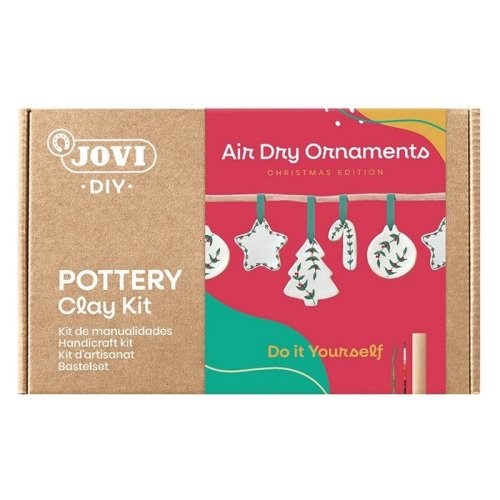 Sada na výrobu keramiky s hlinou Air Dry obsahuje podrobný návod, 500 g hlíny Air Dry, 1 váleček, 5 modelovacích pomůcek, 1 brusný papír, 8 barev Gouache Tempera 15 ml, 2 umělecké štětce, 1 zápisník a 1 bavlněnou stuhu.