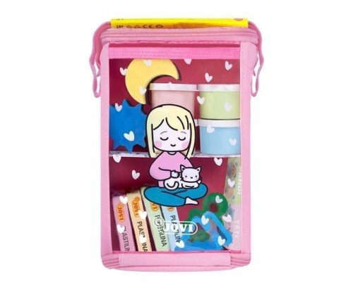 Kreativní batoh pro malé šikulky. Obsahuje: 4 x 35 ml pastelové temperové barvy, 1 štětec, 2 otiskové houbičky, 4 x 50 g pastelové plastelíny, 3 vykrajovátka a 1 předkreslená Kreativní kartonová podložka.